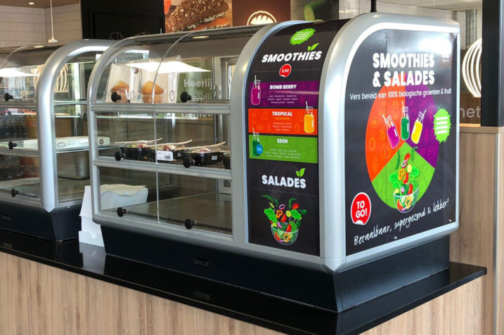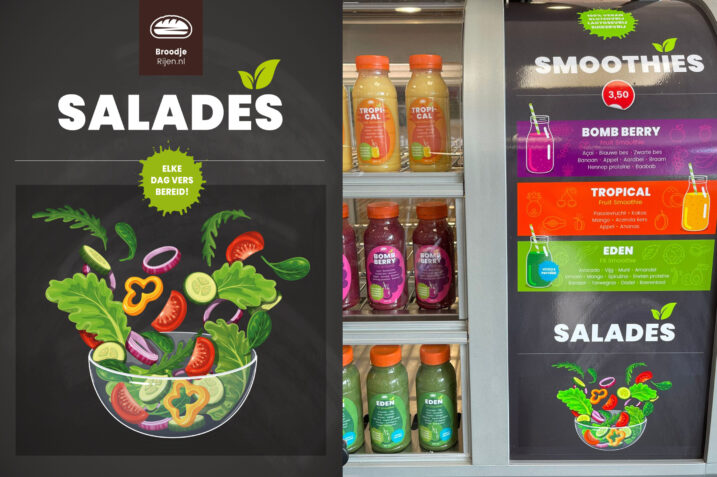 Naast de drie namen en logo’s die NJI bedacht: Broodje Rijen, Shell Rijen en Carwash Rijen, ontwikkelt NJI meer dan dat alleen. In deze leuke en dankbare samenwerking buigt NJI zich over alle marketinguitingen die je maar kunt bedenken, zo ook een etikettenlijn van de heerlijke smoothies en de signing van de salade- en smoothiebar van Broodje Rijen. Het is de moeite waard deze locatie te bezoeken. Broodje Rijen, Shell Rijen en Carwash Rijen vormen een lust voor het marketingoog!