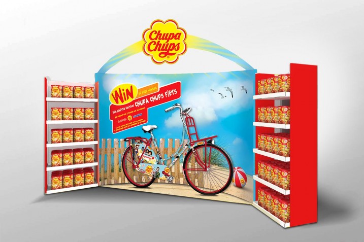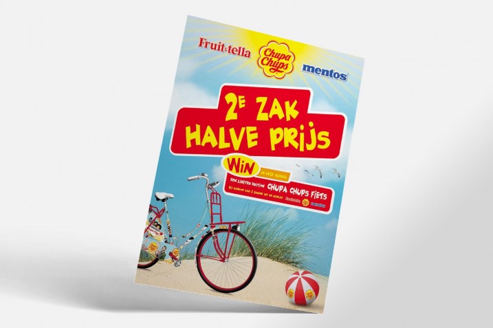 Chupa Chups zijn het hele jaar om je vingers bij af te likken. Ook in de lente! Om juist in deze periode de aandacht op Chupa Chups te vestigen, lanceerde snoepjesmaker Perfetti Van Melle een winkelactie, waarbij een originele Chupa Chups fiets te winnen viel bij aankoop van twee zakken Chupa Chups, Mentos of Fruittella. NJI gaf de actie smoel, door een displaywand, displayvloer en leaflet (voor bij de kassa) te ontwerpen. Om de fiets – in limited edition – er uit te laten springen, koos NJI voor een rustig zomers decor aan het strand. De levensgrote displays (inclusief de echte fiets) stonden in de winkels van AH, C1000 en Emté.