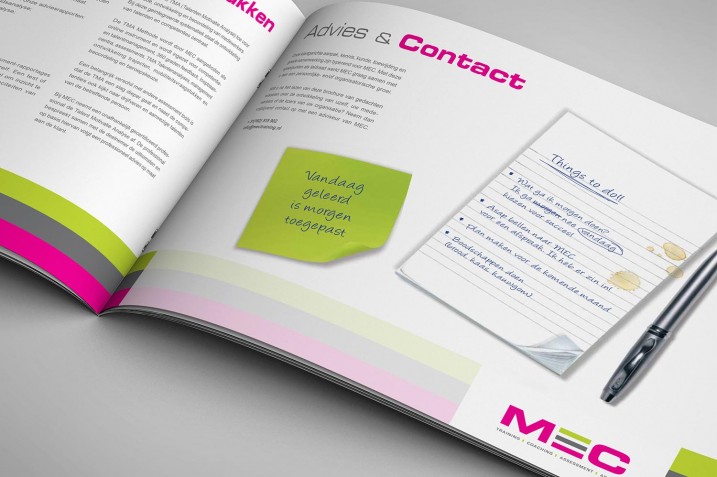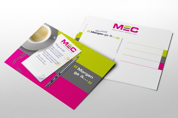 De verhuizing van MEC naar de begane grond van het pand (van NJI) aan het Minervum 7444 in Breda was de aanleiding voor de restyling van het logo en de huisstijl van deze trainers en coaches. NJI ging voor MEC aan de slag en voegde de kleur van het bedrijfspand, fris groen, toe aan de huisstijl van MEC. Alleen al het toevoegen van deze aansprekende kleur zorgde voor een moderne look & feel die de frisse aanpak van MEC weerspiegelt. Het gekozen lijnenspel zorgt bovendien voor herkenning. Daarnaast introduceerde NJI voor MEC een communicatieboom die een rol speelt in diverse communicatie-uitingen.