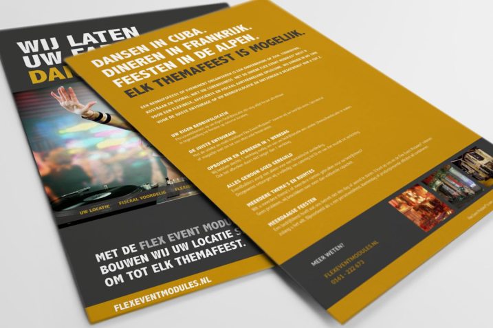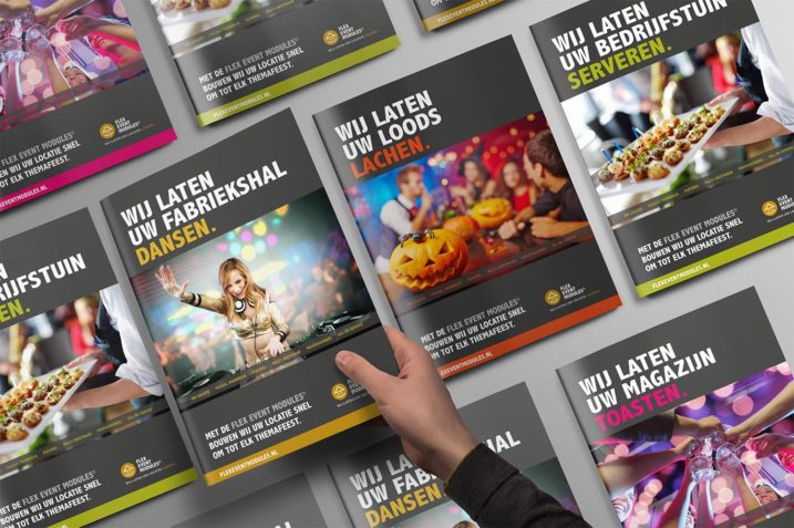 Zo bedacht NJI de merknaam Flex Event Modules© in combinatie met de pay-off ‘Wij laten uw locatie lachen’. Een onderscheidend en opvallend logo, dat de lach onder het eigen dak uitbeeldt, is het gezicht van deze bedrijfsactiviteit geworden. Om het merk in één keer goed in de markt te zetten, werkte NJI tevens een campagnelijn uit. Let´s party, maar dan wel op een eigen bedrijfslocatie, wat het fiscaal gezien nog eens extra aantrekkelijk maakt. Om alle voordelen goed uit te lichten, begeleidde NJI ook de totstandkoming van een tekst waarin al die voordelen staan.