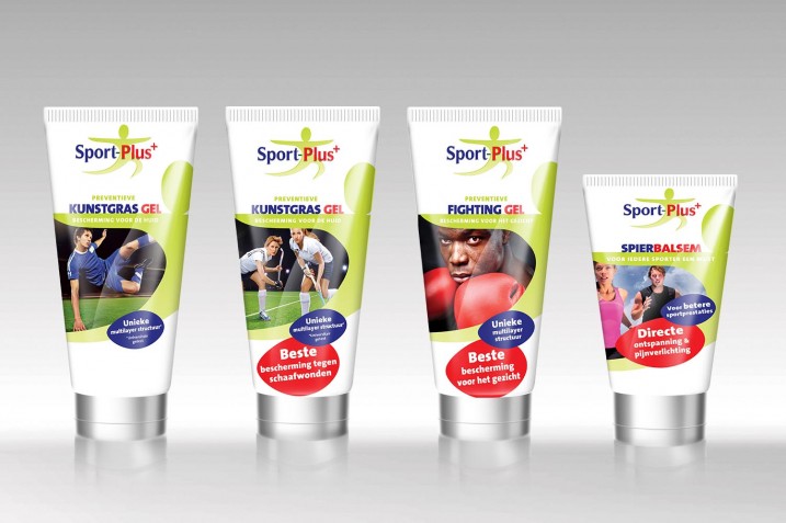 Sportplus+ levert middelen die sporters faciliteren bij het uitoefenen van hun sport. Om direct op de verpakking te zien voor welke sporters en situaties het product is bedoeld, ontwierp NJI een professionele verpakkingslijn voor o.a. spierbalsem, kunstgrasgel en fighting gel.