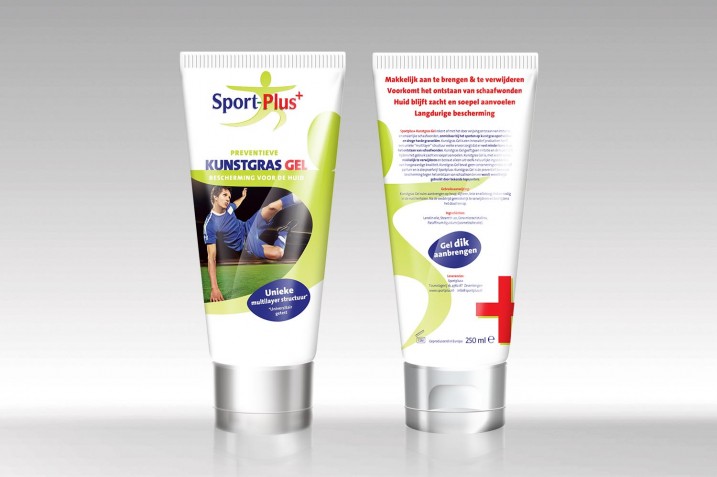 NJI vergrootte het beeldmerk van Sportplus+, en liet dat vanaf de voorzijde van de verpakking doorlopen op de achterzijde. In het beeldmerk staat een foto van een herkenbare sportsituatie, zoals de voetballer die zijn been beschadigt bij een val op het kunstgras. Vooral deze foto maakt in één oogopslag duidelijk voor wie en in welke situaties het sportproduct van toegevoegde waarde is. Een absolute plus van deze mooie professionele lijn.