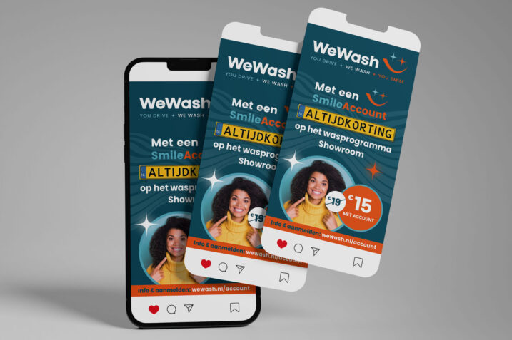 NJI dacht mee over de naam WeWash en voegde daar als pay-off ‘You drive. We wash. You smile.’ aan toe. De kleuren van het indrukwekkende bedrijfspand zijn terug te zien in de huisstijl, aangevuld met het krachtige oranje. Werkelijk over alles mag NJI meedenken, tot en met de kleur van alle wasborstels aan toe. Een geweldige toevoeging aan het portfolio van NJI.